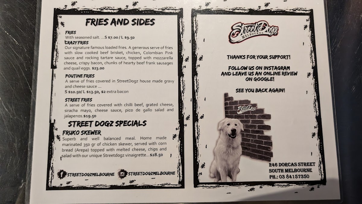 Streetdogz Melbourne, located at 246 Dorcas St, South Melbourne VIC 3205, we invite you on a culinary adventure that’s all about bold flavors and fresh ingredients. Our menu boasts a mouthwatering selection of specialties that are sure to tantalize your taste buds. Dive into our renowned Paco Hot Dog Especial or enjoy the indulgent Crazy Fries that have become a crowd favorite. For something uniquely delicious, don’t miss The Elvis or the playful Salchipapa Locas. Whether you're in the mood for classic Hot Dogs and Fries or craving something sweet like our Jugo Hit Mora, there’s a treat for everyone. Each dish is crafted with love and creativity, making every bite an unforgettable experience. Come on down and discover your new favorites today!